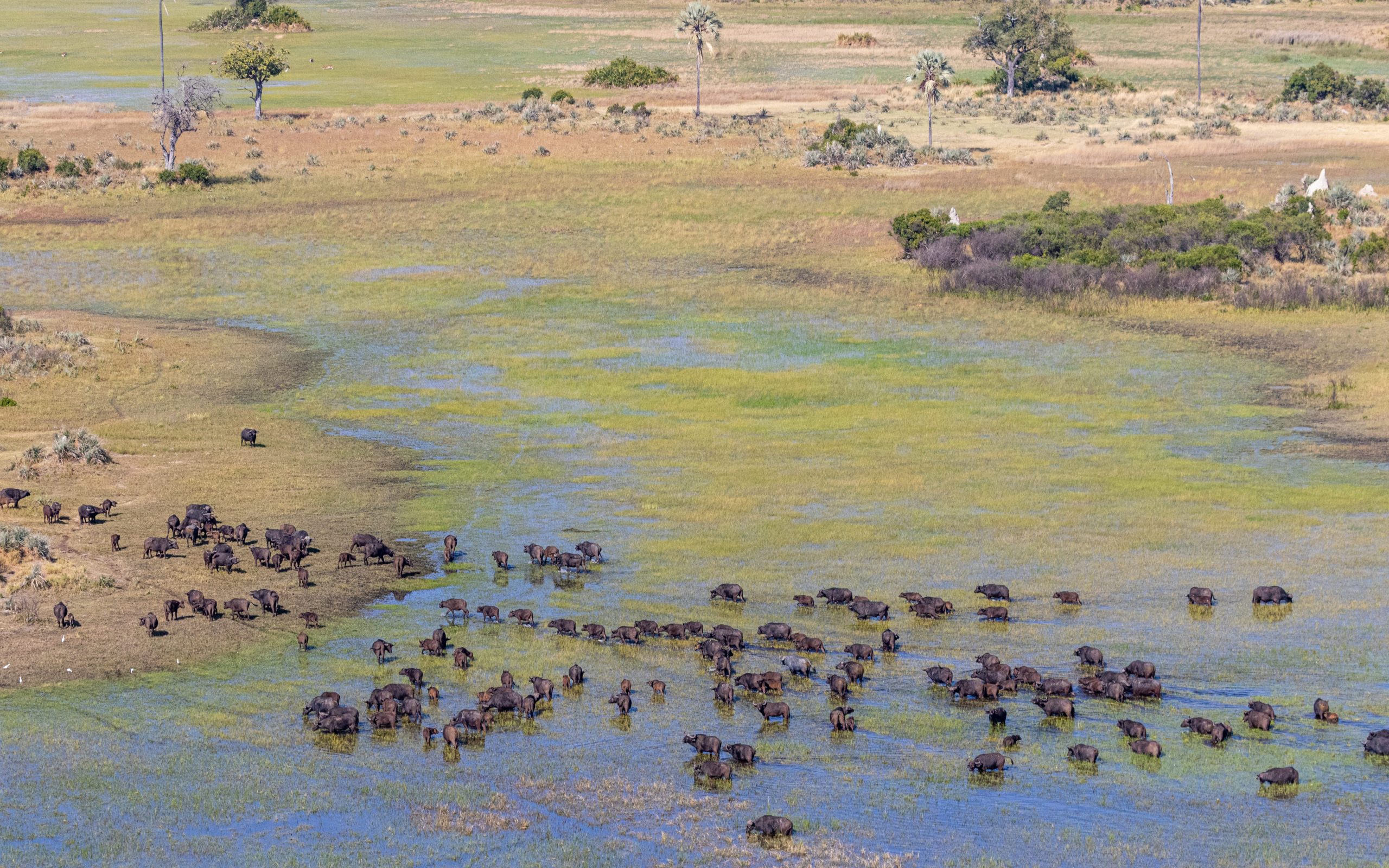 Helicopter flights over the Okavango Delta reveal the vast mosaic of channels, islands, and lagoons from above, offering a breathtaking perspective of the landscape and its wildlife.